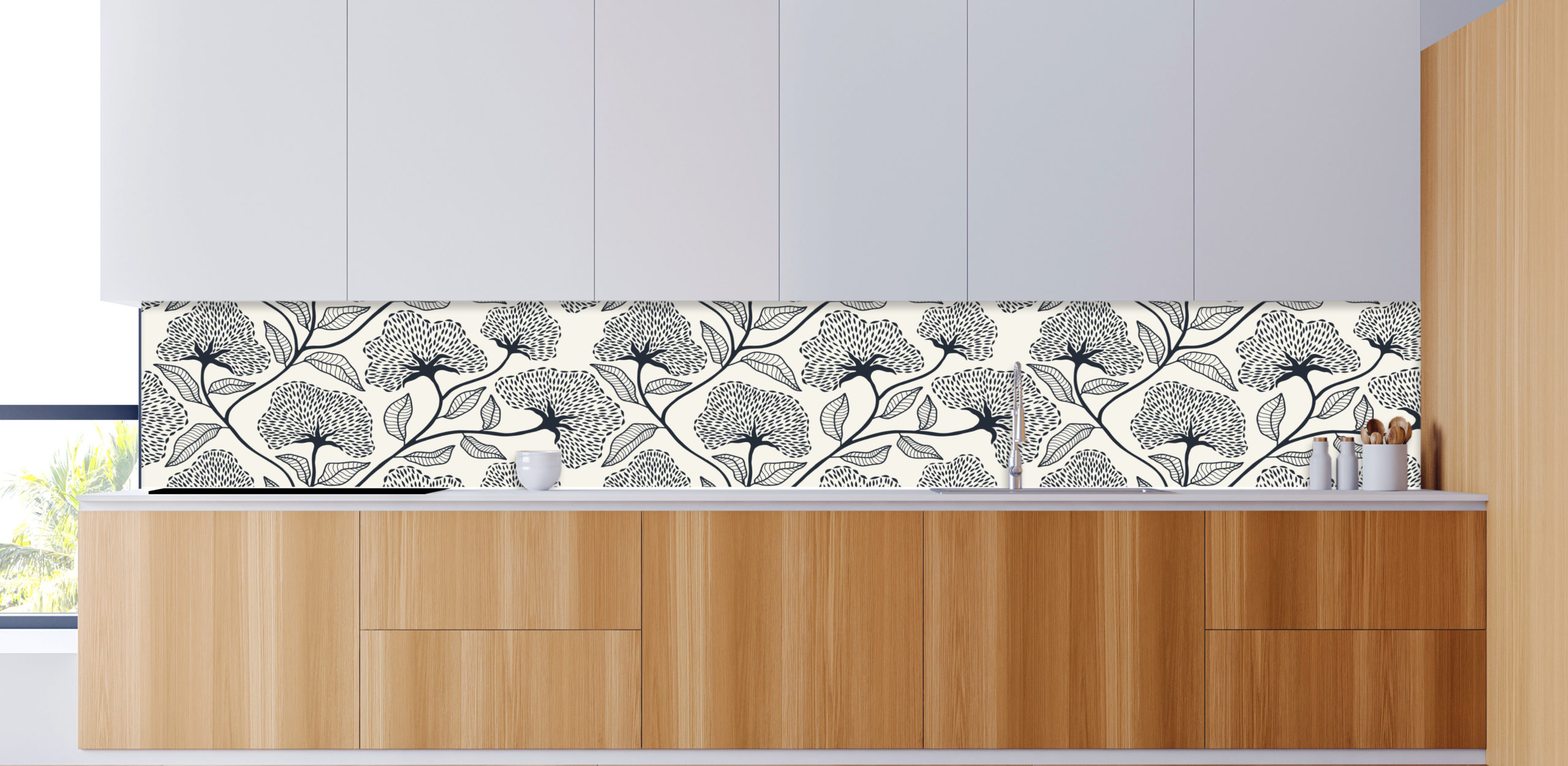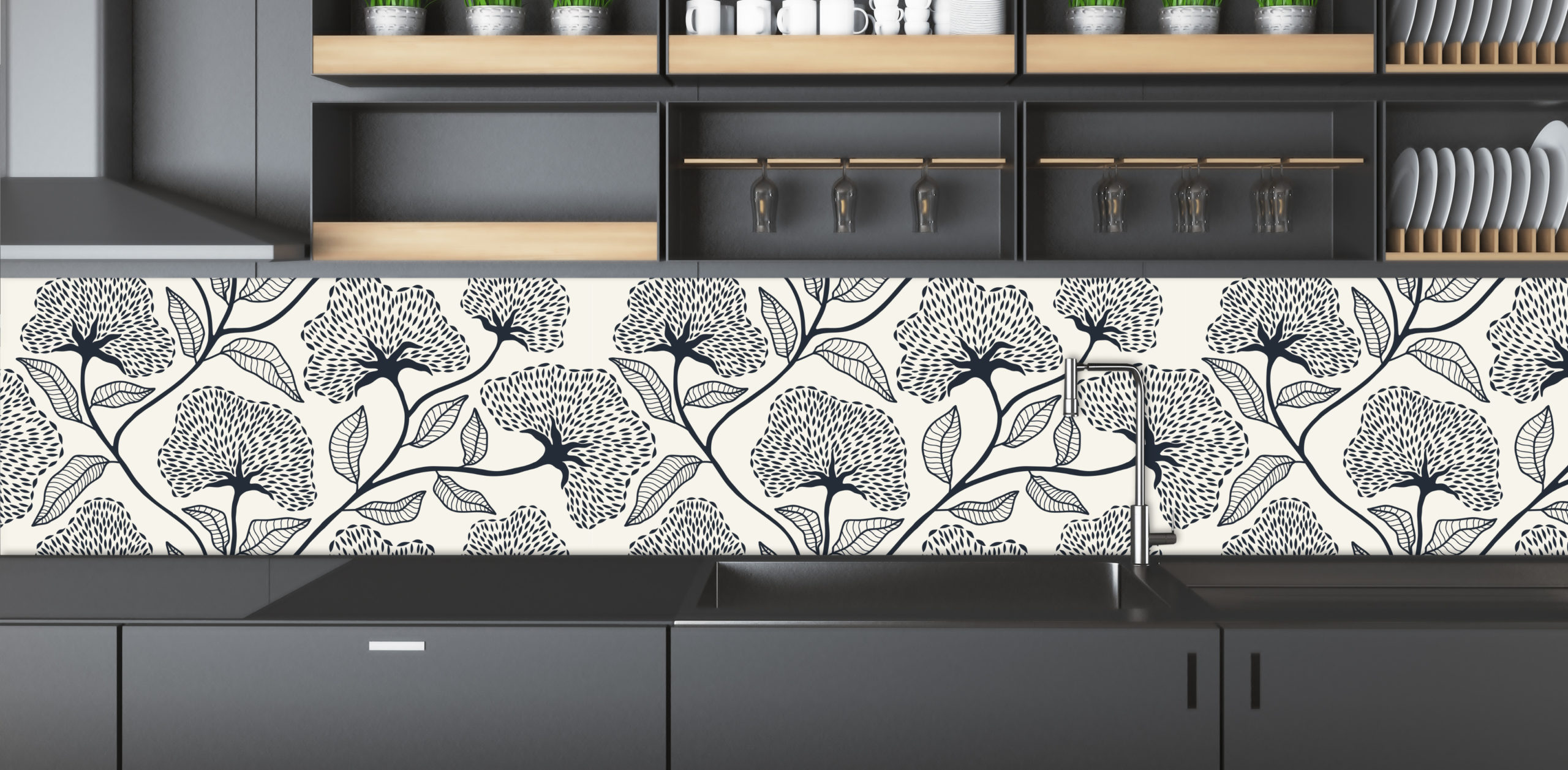 Envie d’apporter un style floral unique et élégant à votre cuisine, cette crédence panoramique fleurs bleu et ses grands motifs dans le style art déco sera parfaite !
