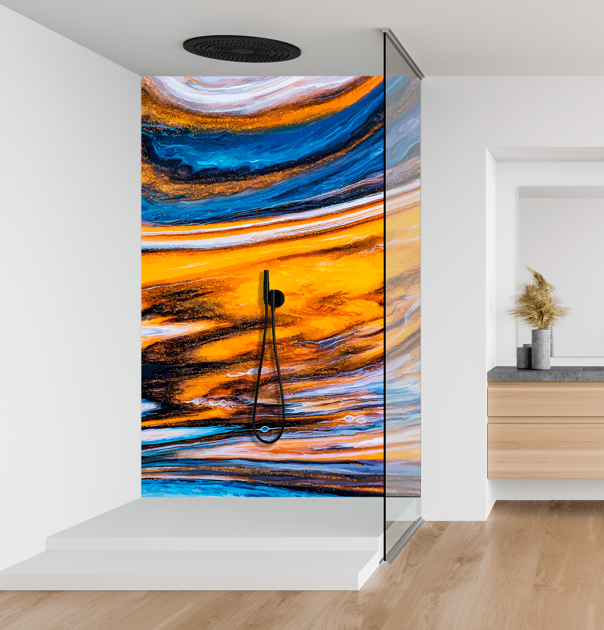 Vous recherchez un panneau de décoration lumineux, au motif unique et original pour décorer votre salle de bain ? Voici une toile fluide art abstraite qui devrait vous plaire. Cette crédence panneau de douche artistique et ses couleurs éclatantes de jaune et de bleu, rendra votre pièce chaleureuse et stylée.