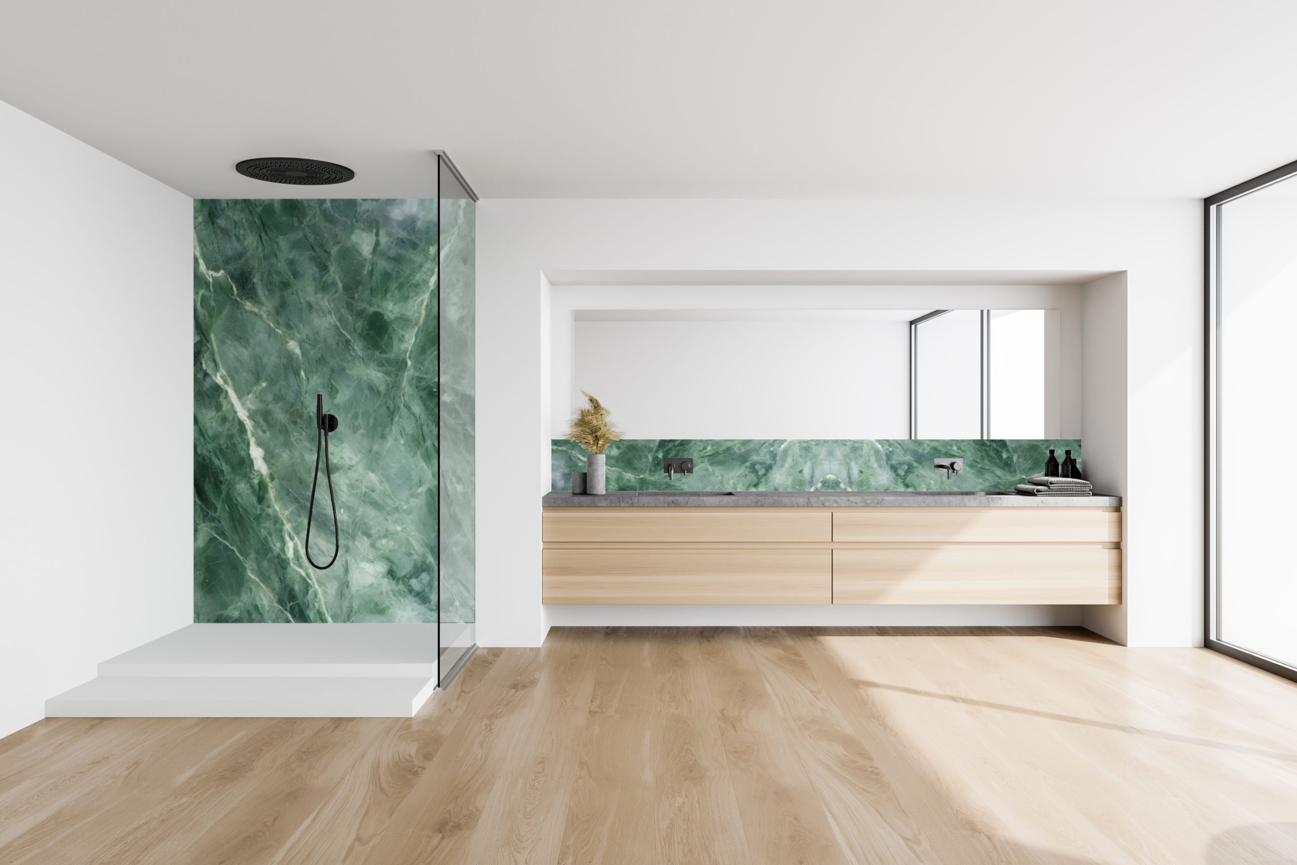 Optez pour une valeur sure et un effet matière chic et indémodable dans votre salle de bain avec cette crédence panneau de douche effet marbre vert.