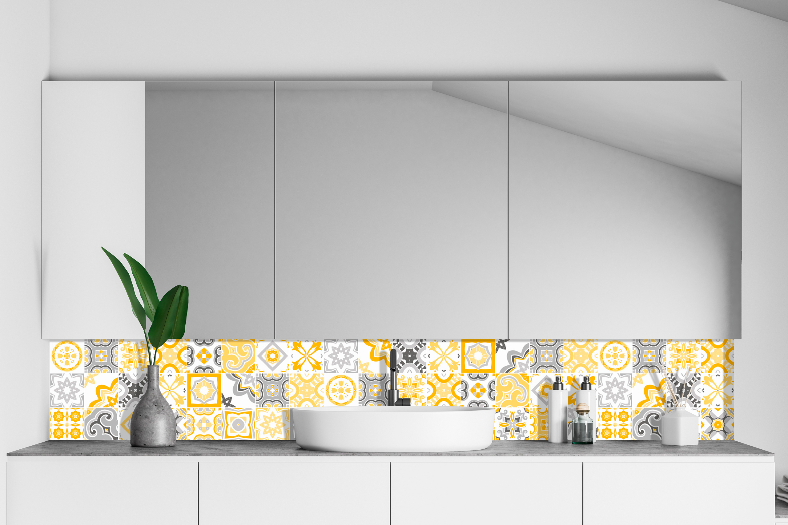 Sensibles au charme des carreaux de ciment ? Optez pour une valeur sure avec cette crédence panneau de vasque carreaux ibériques dans l’air du temps, en version jaune et gris, qui embellira votre salle de bain et lui apportera une ambiance vintage.