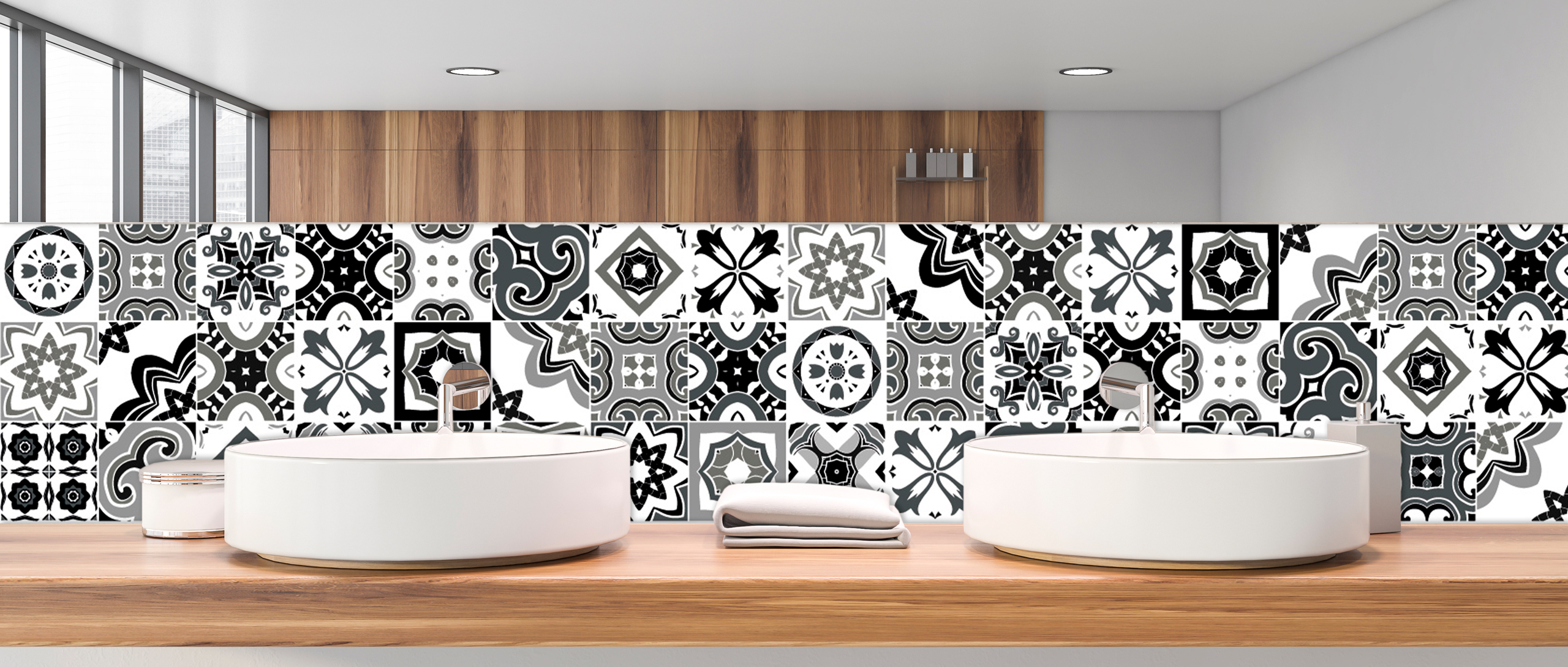 Sensibles au charme des carreaux de ciment ? Optez pour une valeur sure avec cette crédence panneau de vasque carreaux ibériques dans l’air du temps, en version noir et blanc, qui embellira votre salle de bain et lui apportera une ambiance vintage.