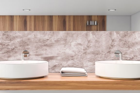 Apportez de la modernité et un style unique à votre salle de bain, avec cette crédence panneau de vasque effet tadelakt taupe.