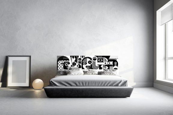 Vous aimez l’art abstrait et souhaitez mettre un peu de fantaisie et un petit grain de folie dans votre chambre ? Cette tête de lit, résolument contemporaine, illustrant des personnages décalés en noir et blanc, vous plaira. Originalité garantie !